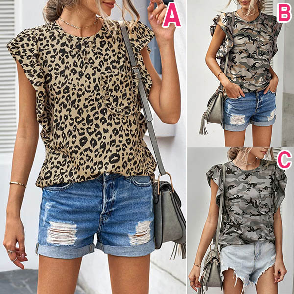 Fashion Lotus Sleeve Round Neck Leopard/Camouflage Printed T-shirt