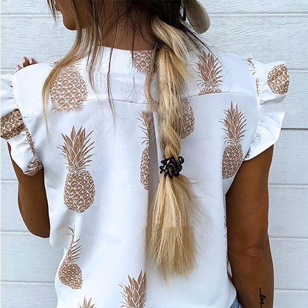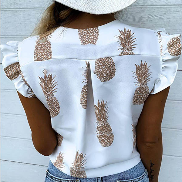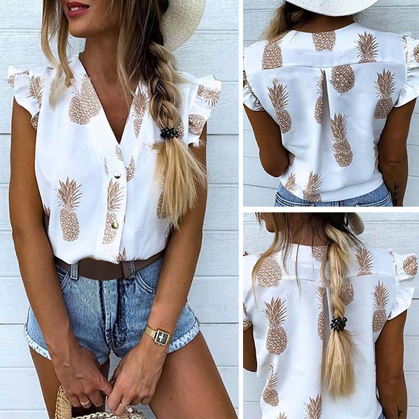 For these summer days,this sleeveless top can be your good choice. The pineapple printed pattern design makes it look so chic,while the lotus sleeve and v-neck design will further enhance your charm. Try to match with a shorts to have a stylish summer style.