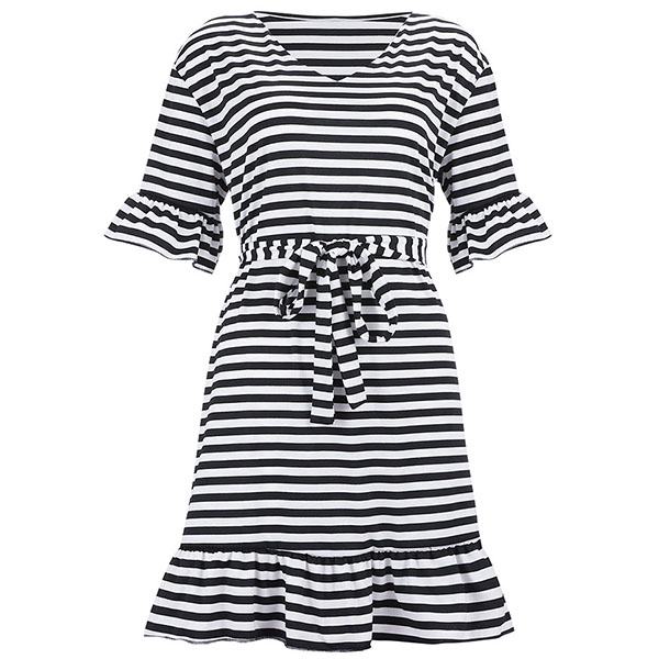 Hey,girls,you can just step out to greet the sunny days with this beautiful dress. This stripe dress is finished with lotus sleeve,ruffle hem and v-neck design,which can exude your sweet and stylish sense. Add this dress to your wardrobe and it won't let you disappointed!