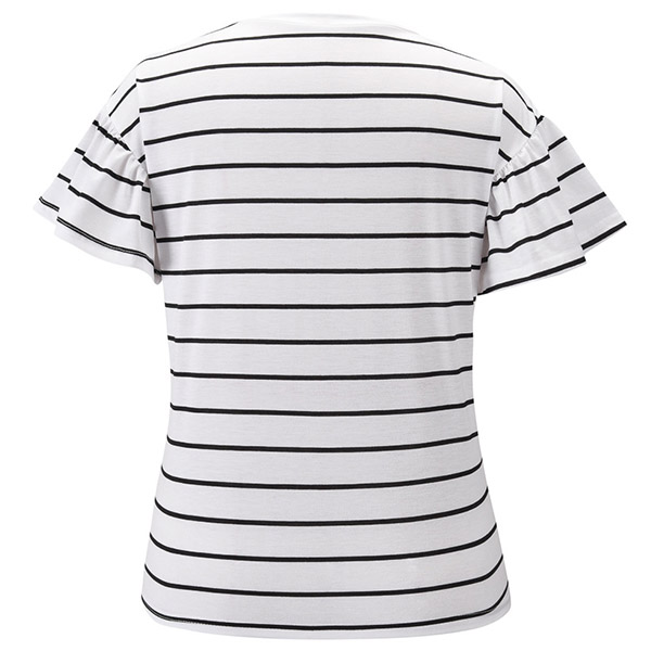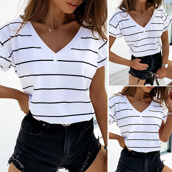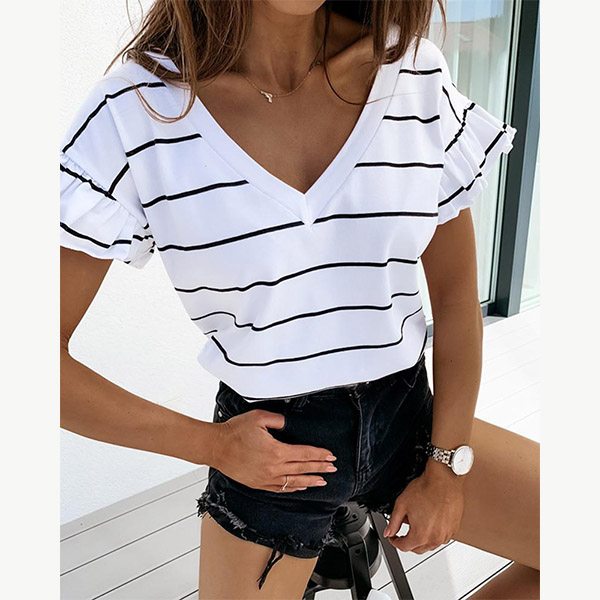 As for a casual yet stylish style,you can have a try this t-shirt. The stripe element design makes this piece look so stylish and popular,while the lotus sleeve and v-neck design will make this piece look more attractive and stylish. All-match design allows to be matched with different style bottoms.