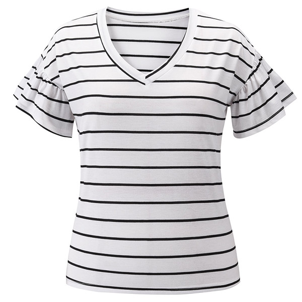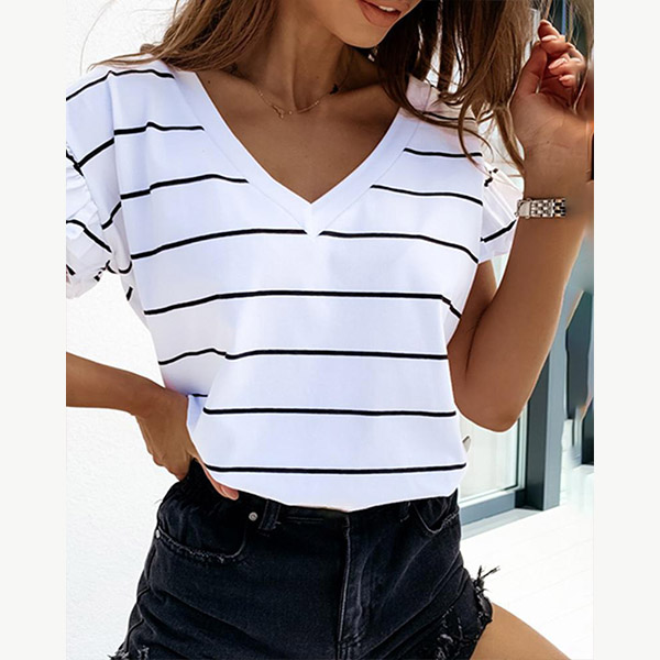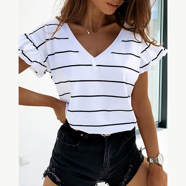 Fashion Lotus Sleeve V-neck Striped T-shirt