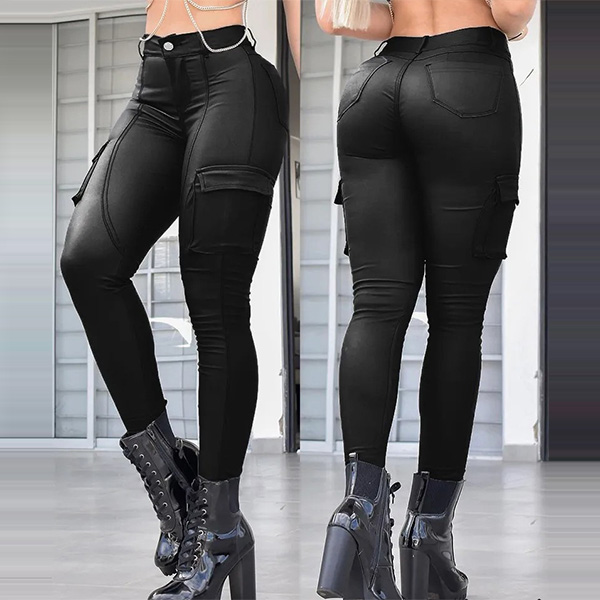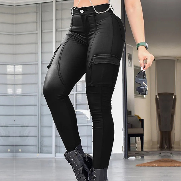 Fashion Low-rise Side Patch Pockets Artificial Leather PU Skinny Pants