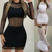 Fashion Mesh-net Crew Neck Long Sleeve Bodycon Mini Dress