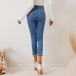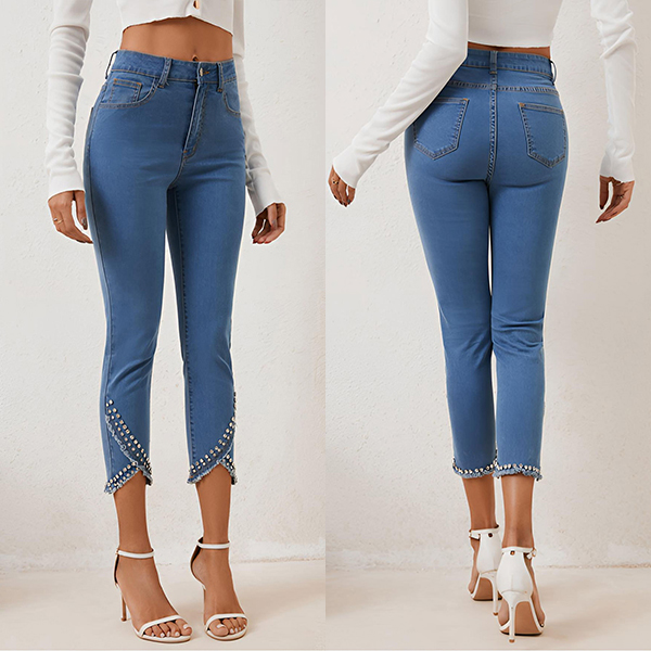 How about this denim jeans? The rivet detailing adds a touch of edginess and style to the jeans, creating a trendy and eye-catching look. The fray hemline adds a unique and modern twist, giving these jeans a fashion-forward edge. Pair them with a graphic tee and sneakers for a casual and cool outfit.