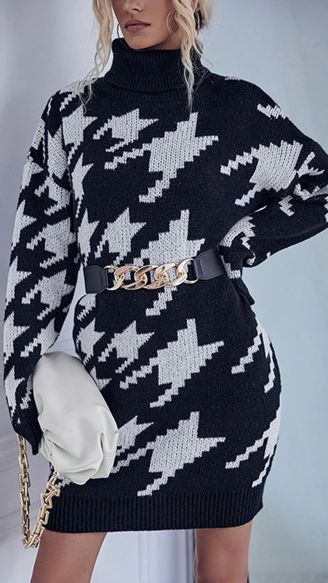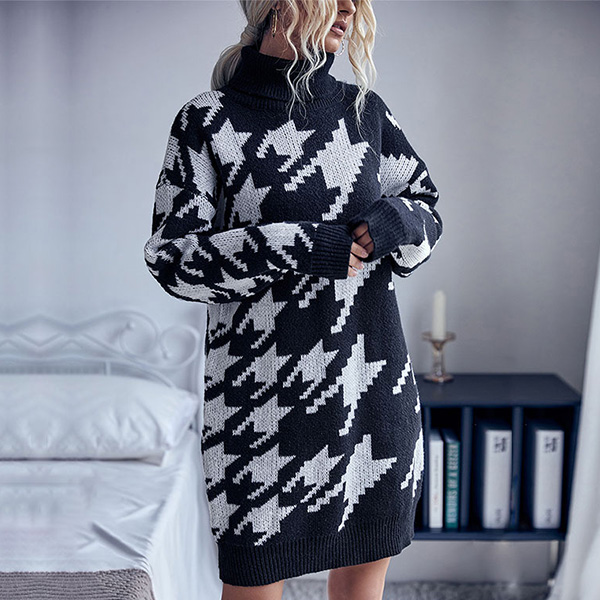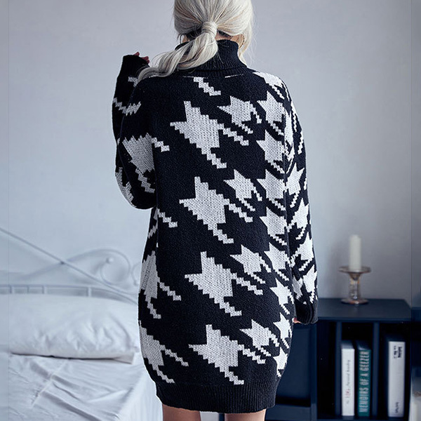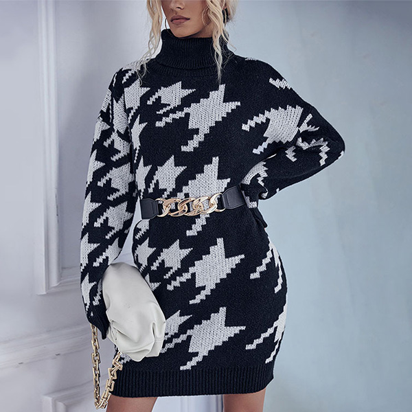 Fashion Mock Neck Houndstooth Printed Long Sleeve Knitted Sweater Dress(without Belt)