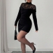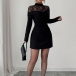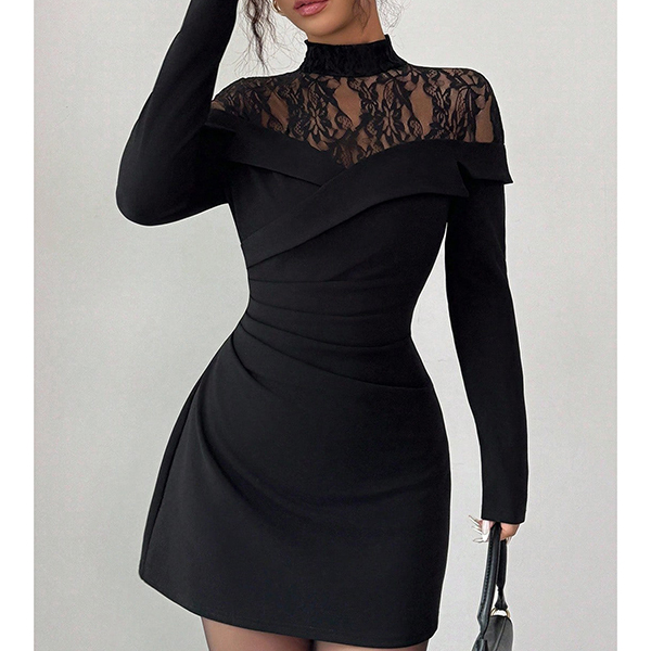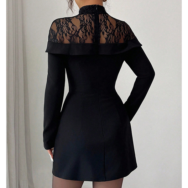 This black dress features contemporary fashion styling with elegant mock neck construction and delicate lace spliced design for modern refined sophistication. Perfect for fashion occasions, contemporary styling, or modern elegant coordination.