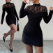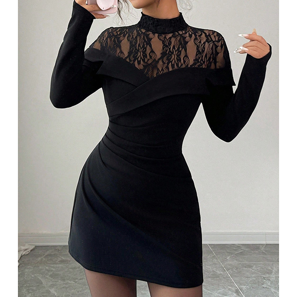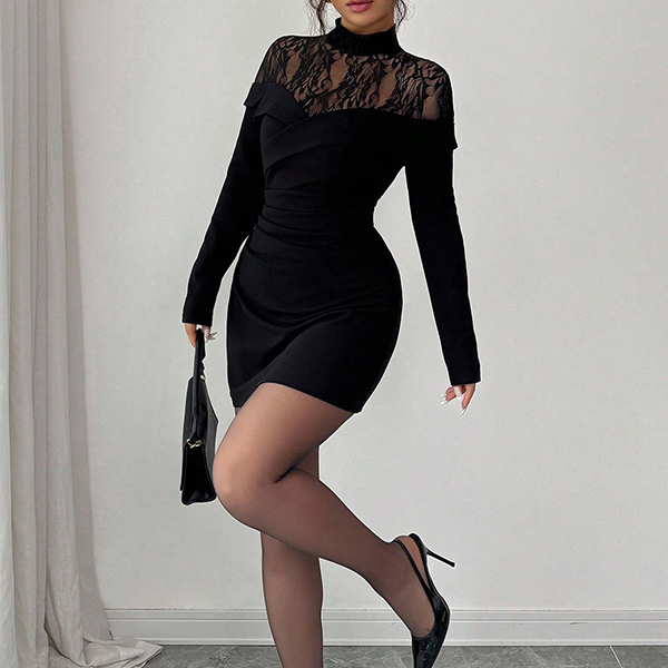Fashion Mock Neck Lace Spliced Long Sleeve Bodycon Dress
