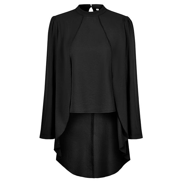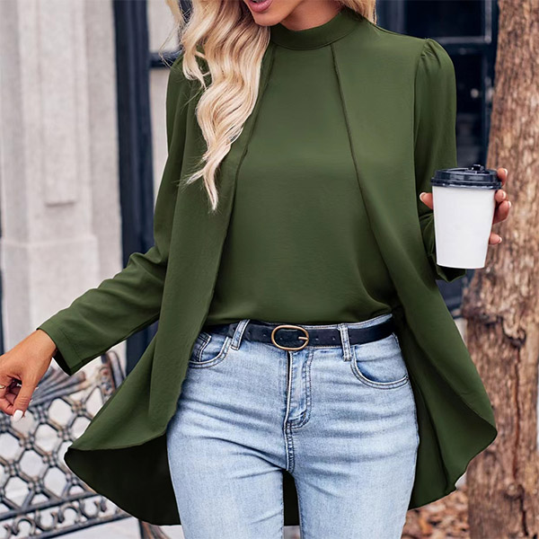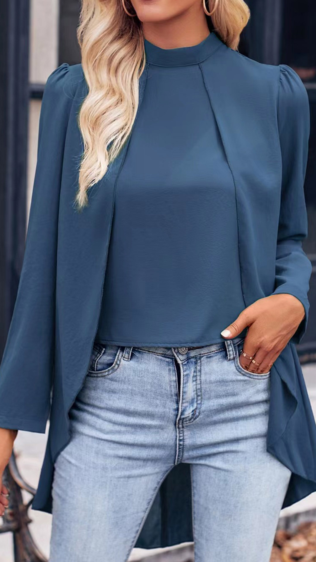 This stylish shirt features a mock neck, long sleeves, a lightweight chiffon fabric. The front slit design make it looks like a cape and a shirt~ Its mock-two-piece design combines sophistication and contemporary flair in one chic garment. Hope you like it.