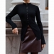 This shirt features modern mock neck styling with functional front button decoration and elegant slit detailing for contemporary structured sophistication. Pair with tailored bottoms and heels for professional sophisticated appeal.