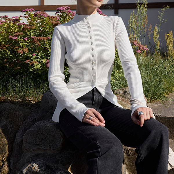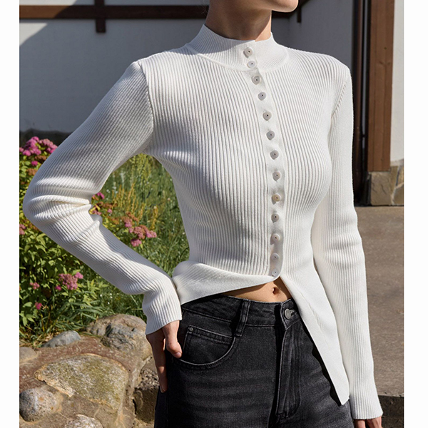 Fashion Mock Neck Long Sleeve Front Button Slit Ribbed Shirt