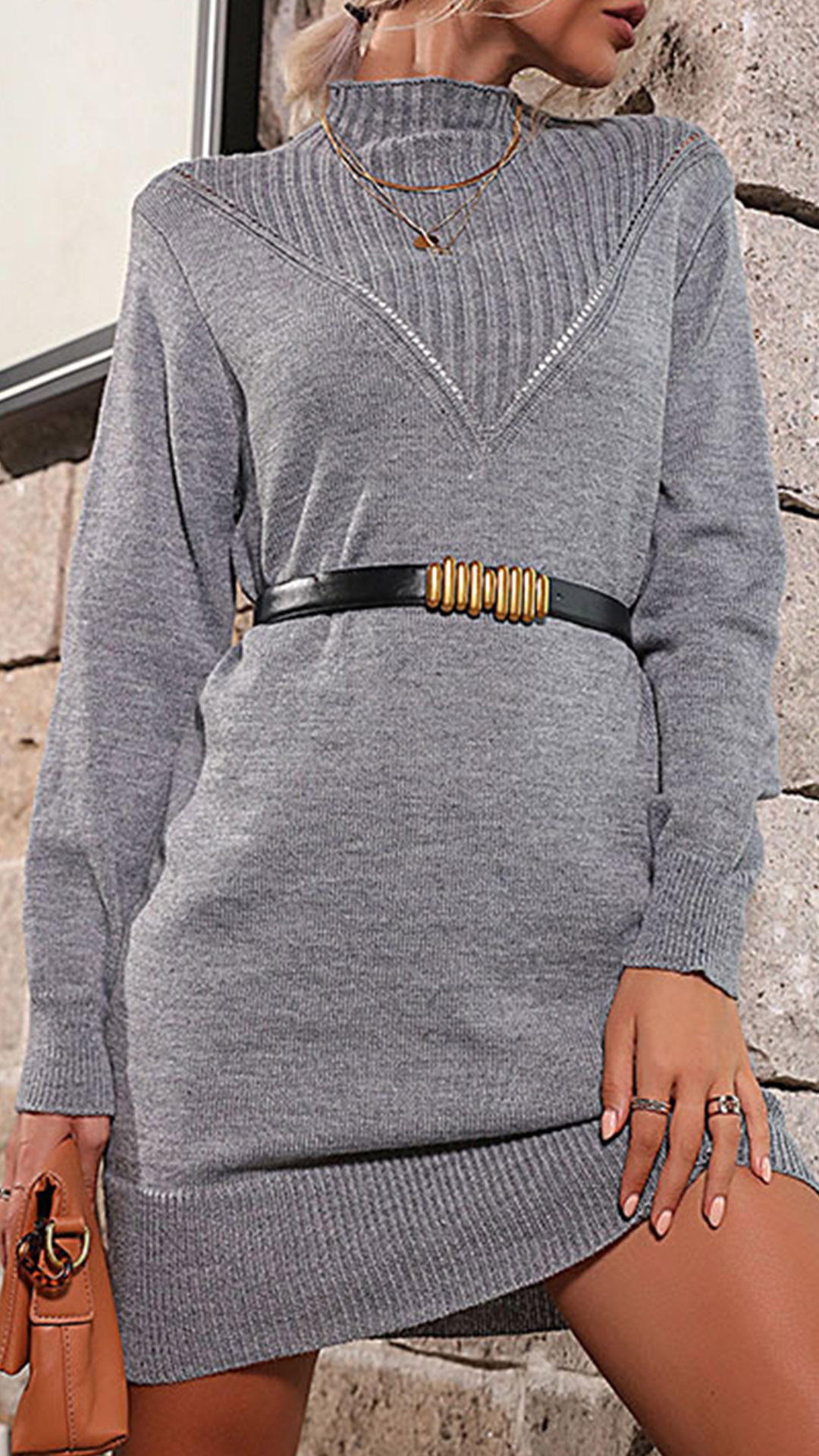 This fashionable knitted dress is the perfect way to stay stylish while staying warm this winter. The mock neck and long sleeves provide an extra layer of warmth and coverage, while the knitted fabric is soft and comfortable.