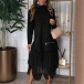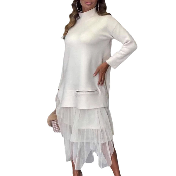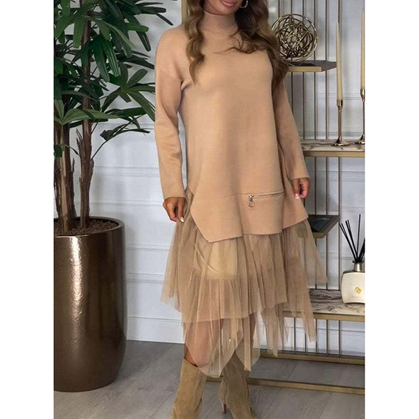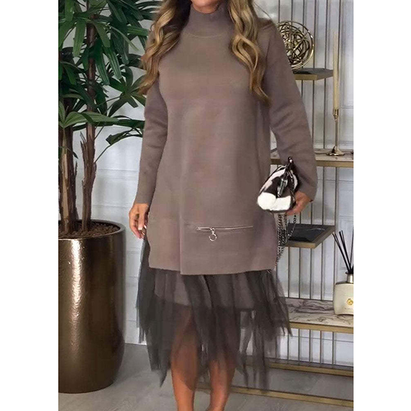 Fashion Mock Neck Long Sleeve Side Zipper Gauze Spliced Hemline Midi Dress