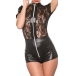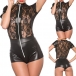 Fashion Mock Neck Short Sleeve Front Zipper Lace Spliced Artificial Leather Lingerie Bodysuit