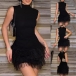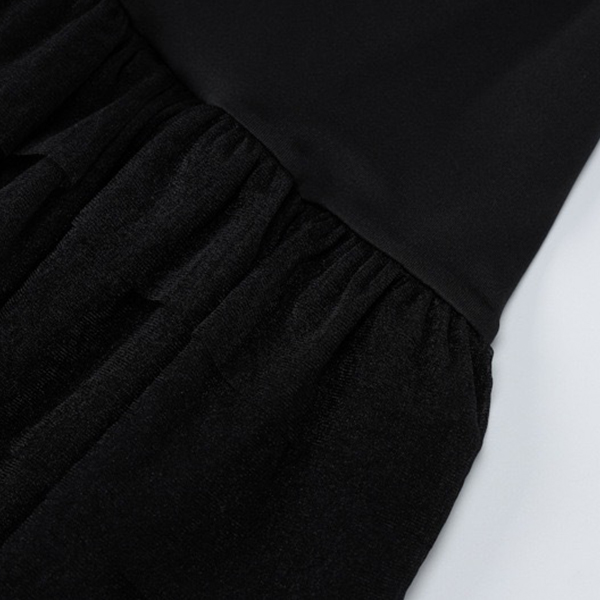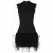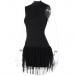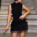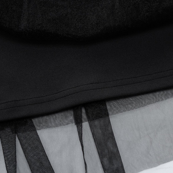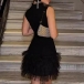 This black dress features mock neckline, sleeveless, gauze spliced along the hemline for a tutu effect. Perfect for dancing ball.