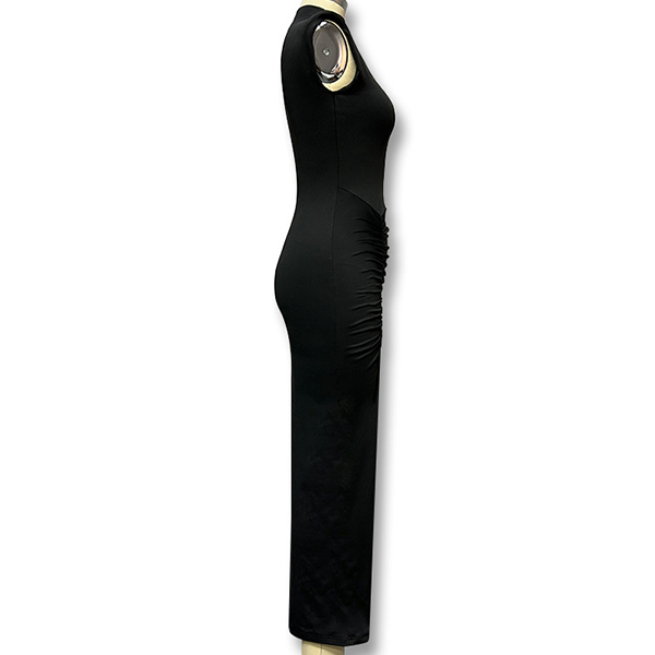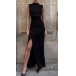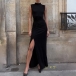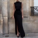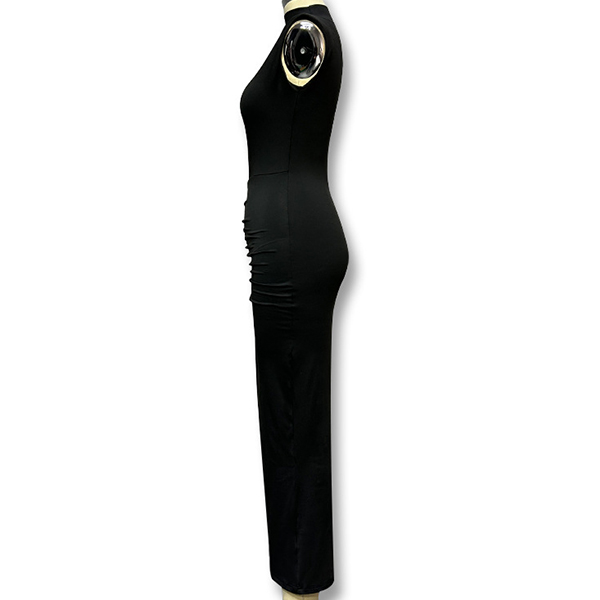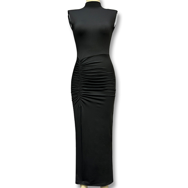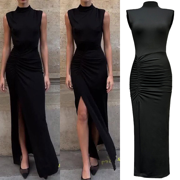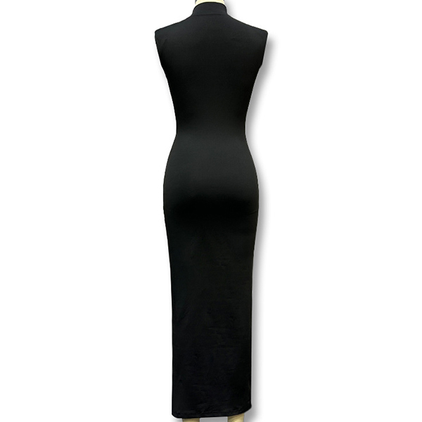 This stunning maxi dress features mock neck, sleeveless and side slit details. It combines a sleek, minimalist silhouette with bold, fashion-forward design elements, creating a chic and modern look.