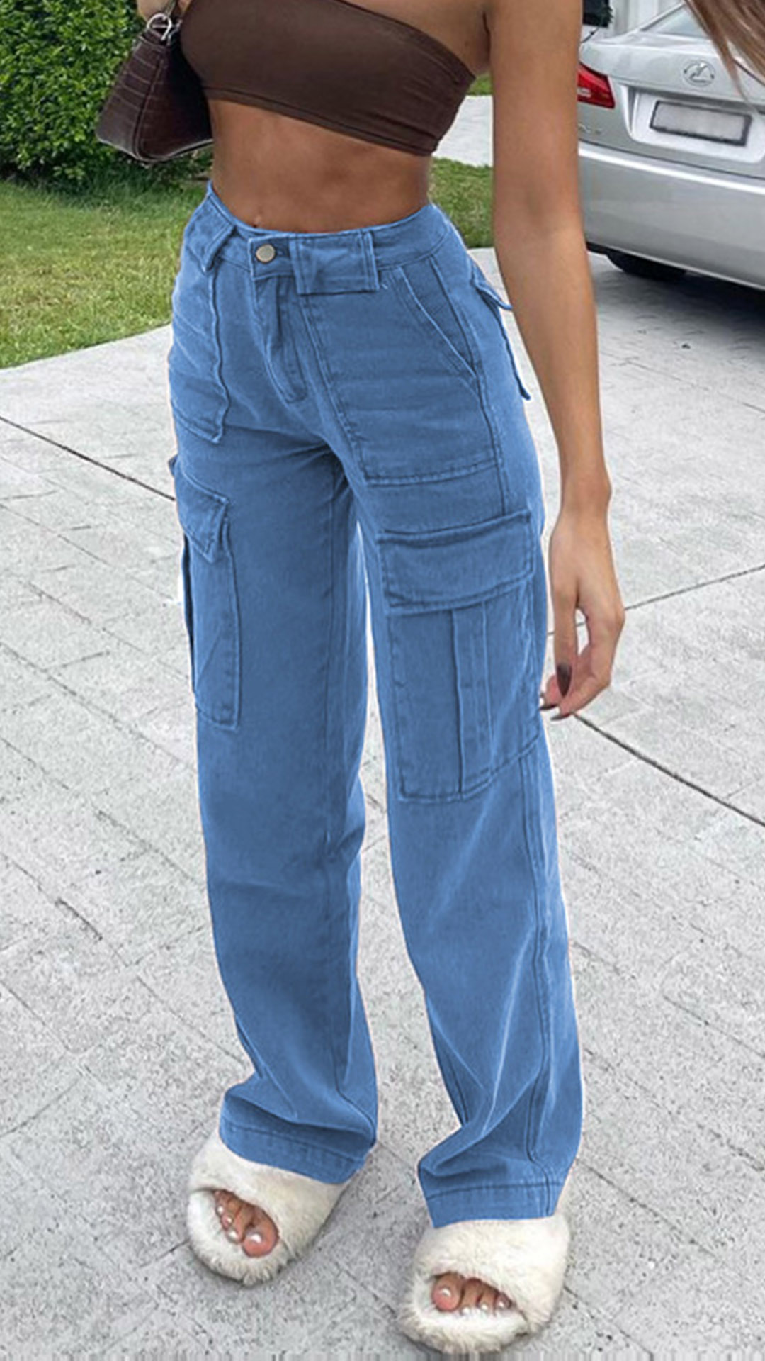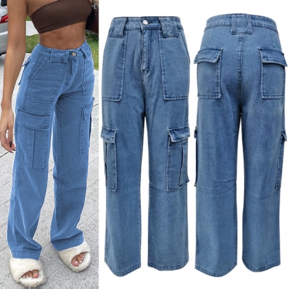 Fashion Multi-pockets Wide-leg Denim Jeans