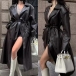 Fashion Notch Lapel Long Sleeve Double-breasted Self-tie Longline Artificial Leather PU Jacket