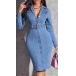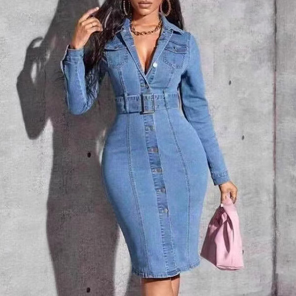 Fashion Notch Lapel Long Sleeve Old-washed Bodycon Denim Dress