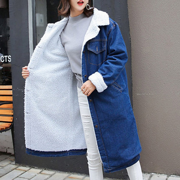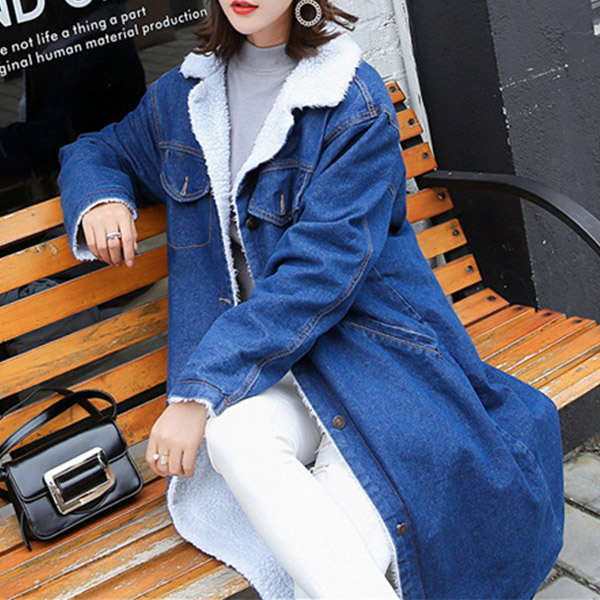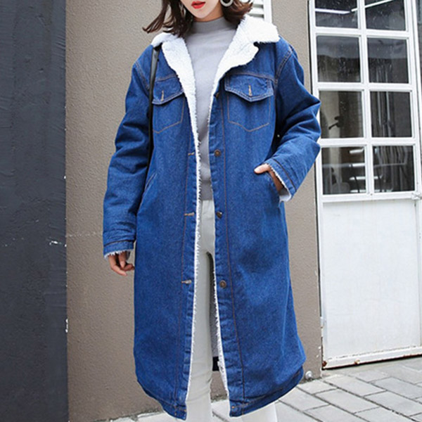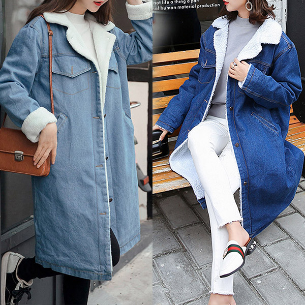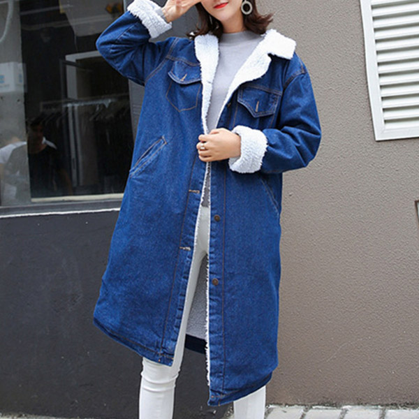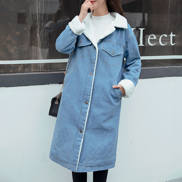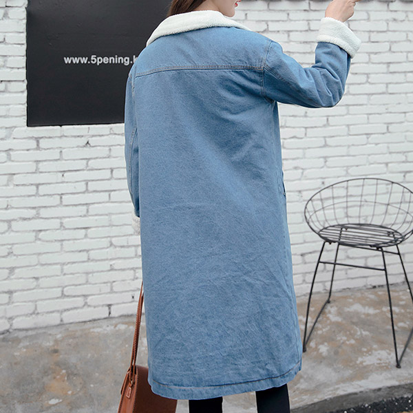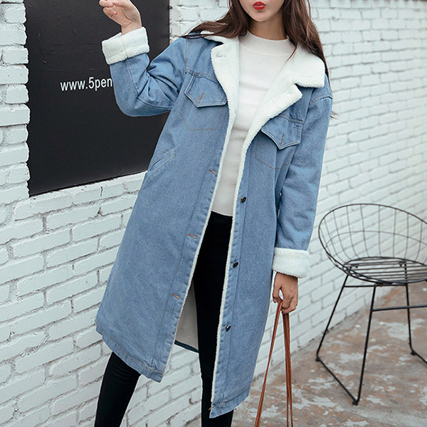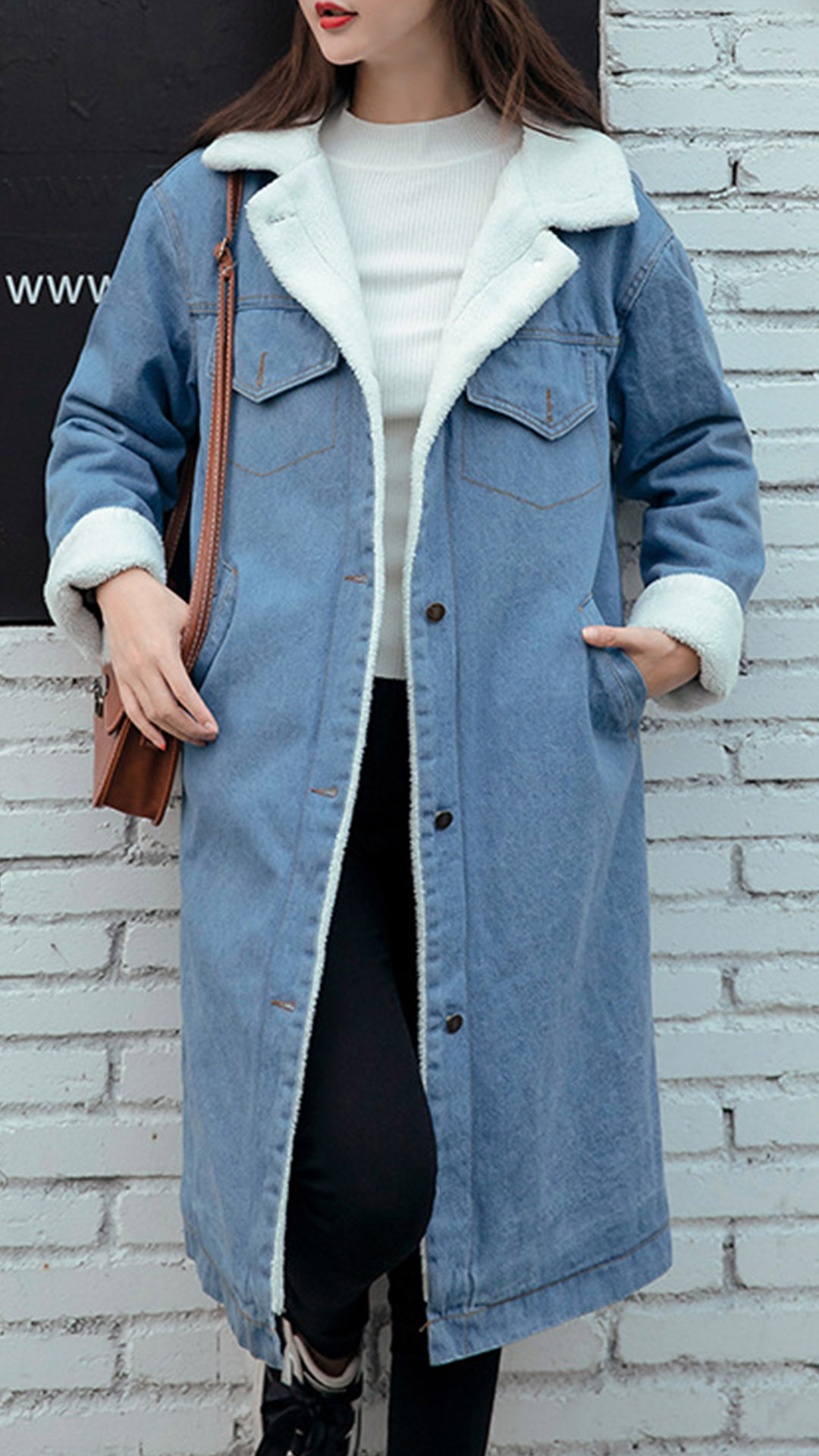 Fashion Notch Lapel Long Sleeve Plush Lined Denim Jacket