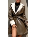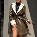 Fashion Notch Lapel Long Sleeve Self-tie Artificial Leather PU Plush Lined Jacket