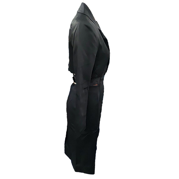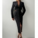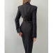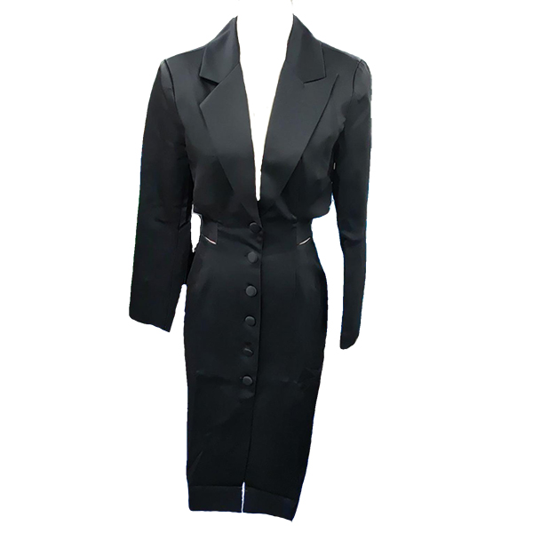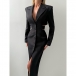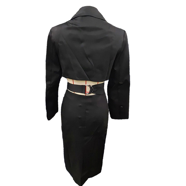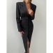 This sophisticated blazer dress combines tailored suiting elements with contemporary cutout details for modern elegance. The notch lapels bring classic professionalism whilst the V-neck creates flattering neckline definition with confident appeal. The front button closure offers traditional tailoring whilst side cutouts add unexpected modern edge. The back bucklet detail provides adjustable fit with sophisticated finishing. Long sleeves ensure complete coverage with structured proportions. This suit dress delivers professional versatility with modern edge.