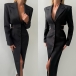 Fashion Notch Lapel Long Sleeve V-neck Front Button Side Cutout Back Bucklet Suit Dress