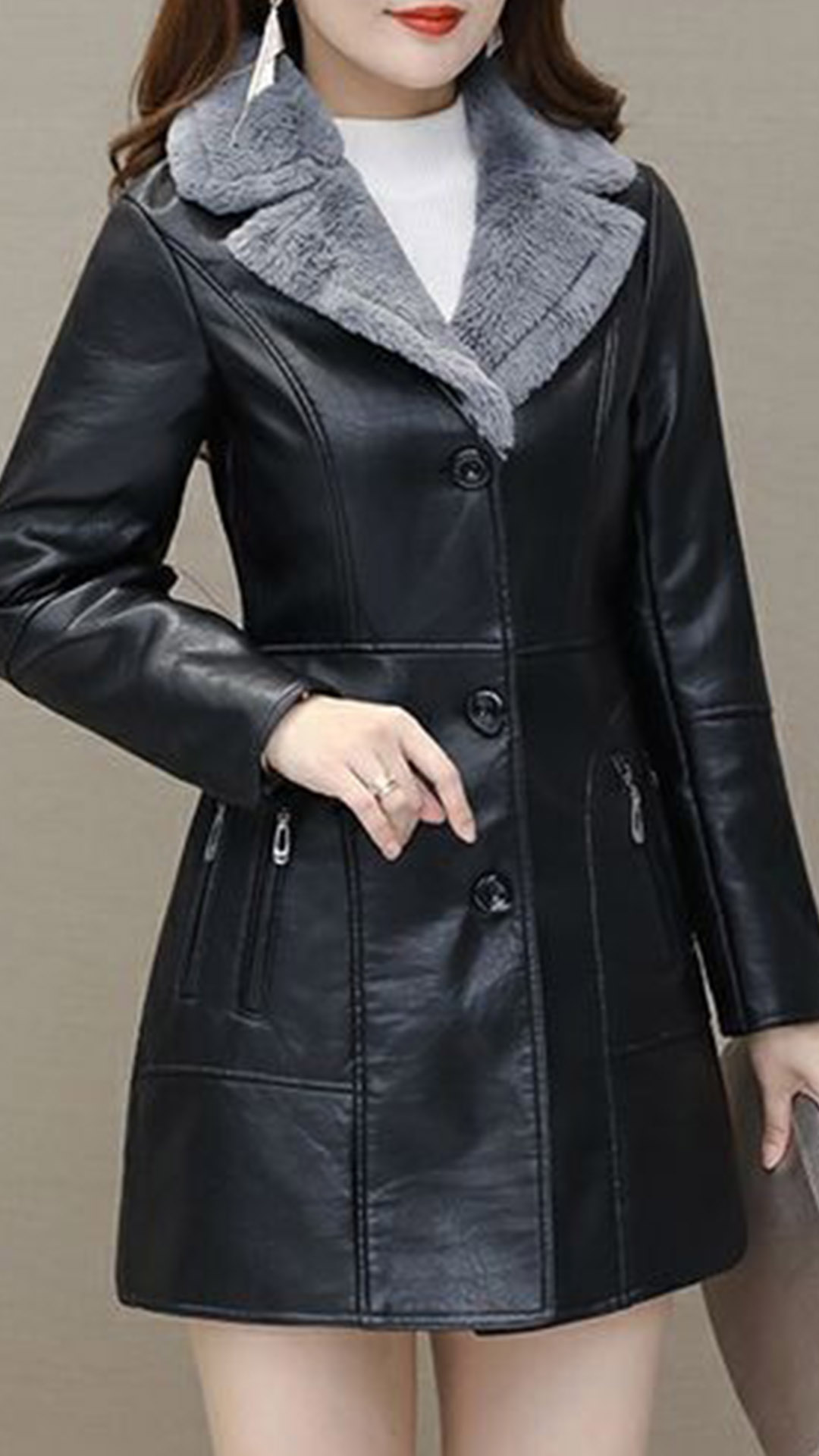 Fashion Notch Lapel Plush Lined Artificial Leather PU Jacket