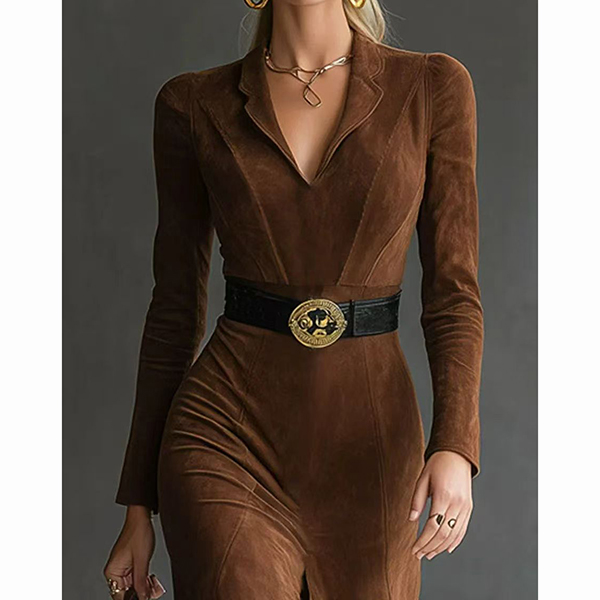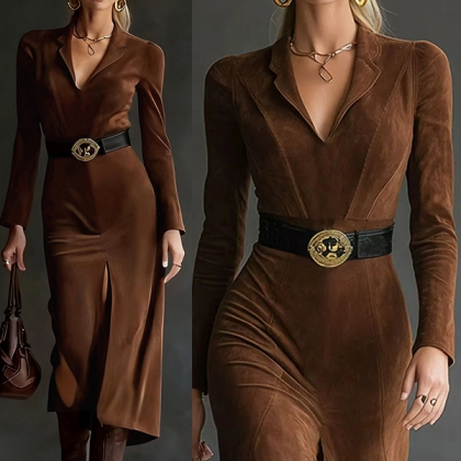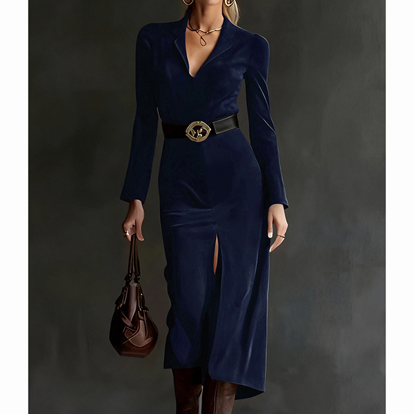 This dress features classic notch lapel styling with flattering V-neck design and elegant slit detailing for contemporary tailored elegance. Multi-colors available.
