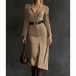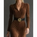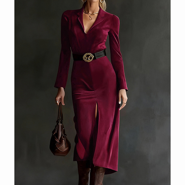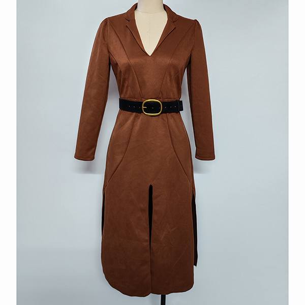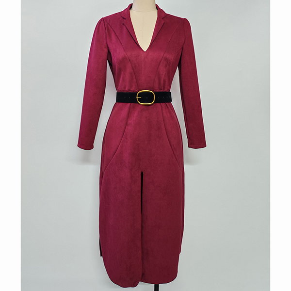 Fashion Notch Lapel V-neck Long Sleeve Slit Dress with Belt