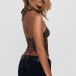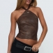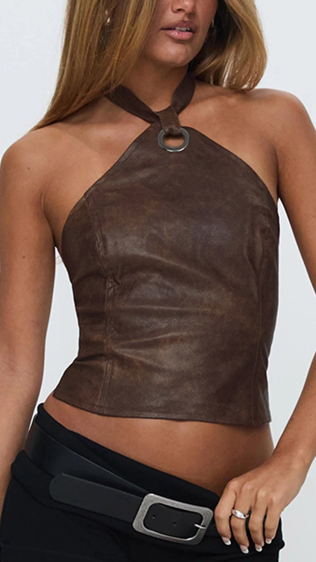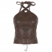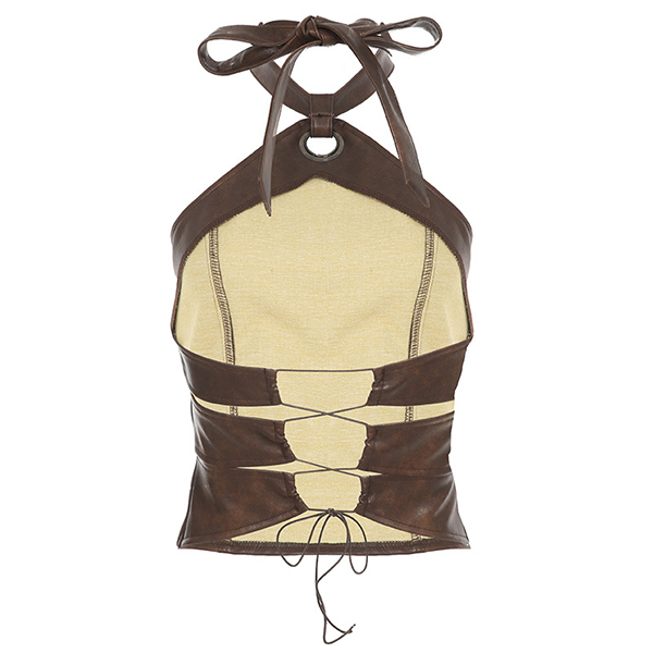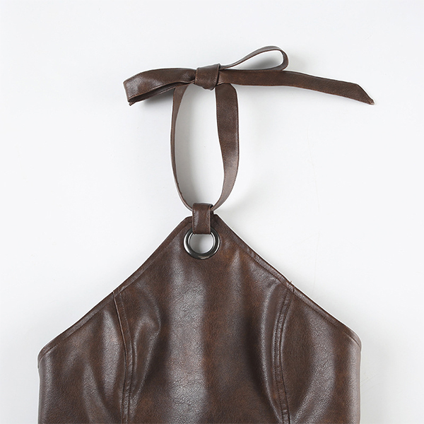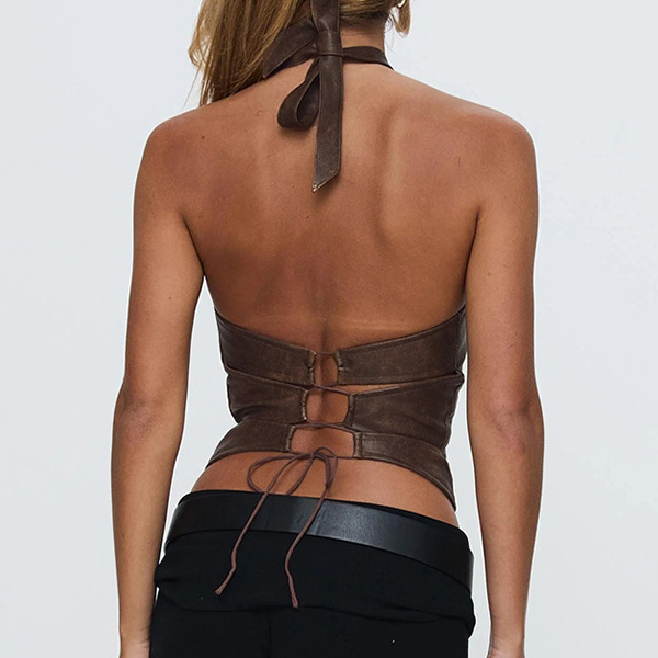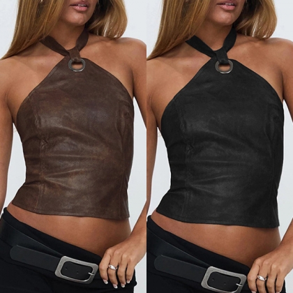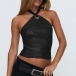 Fashion O-ring Halterneck Backless Lace-up Sleeveless Artificial Leather PU Crop Shirt