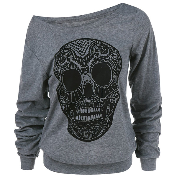Fashion Oblique Shoulder Long Sleeve Skull Head Printed Sweatshirt