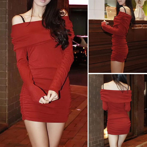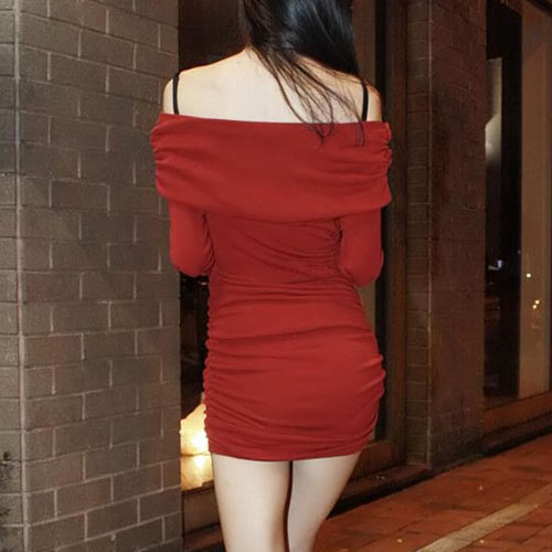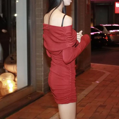 The dress is decorated with solid color and off-shoulder design, with pleated patterns,