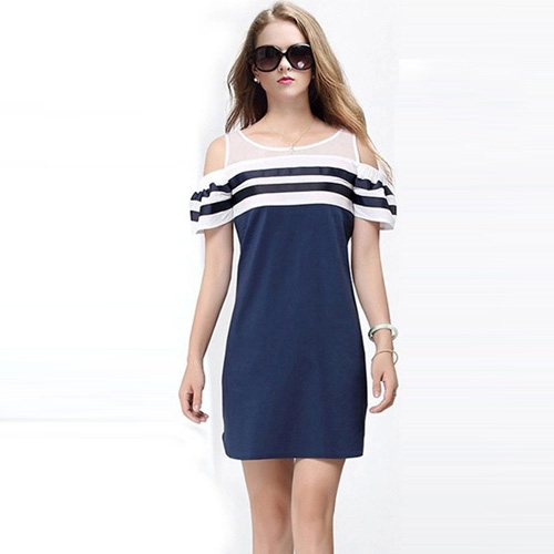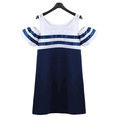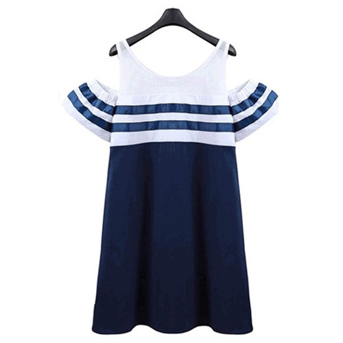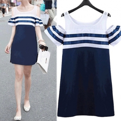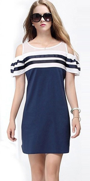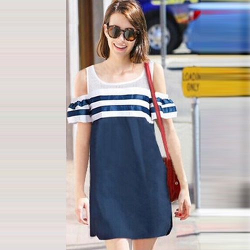 This dress features navy style striped design,stylish and chic. Off-shoulder design makes