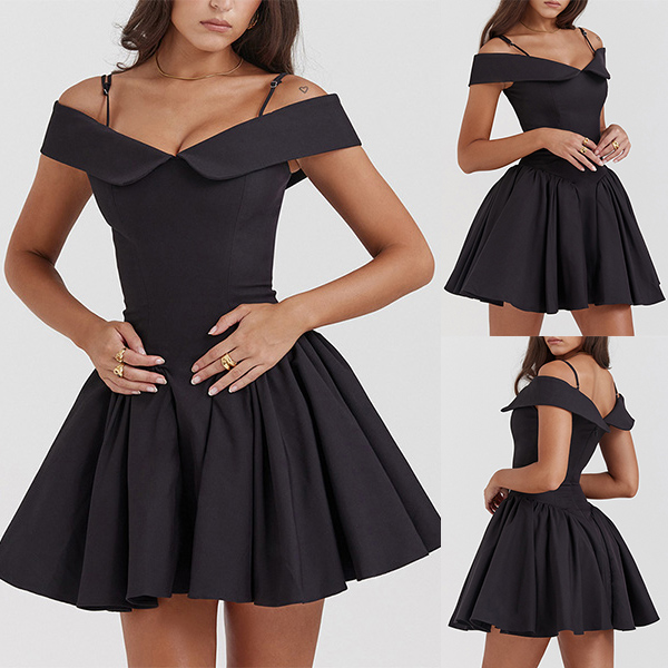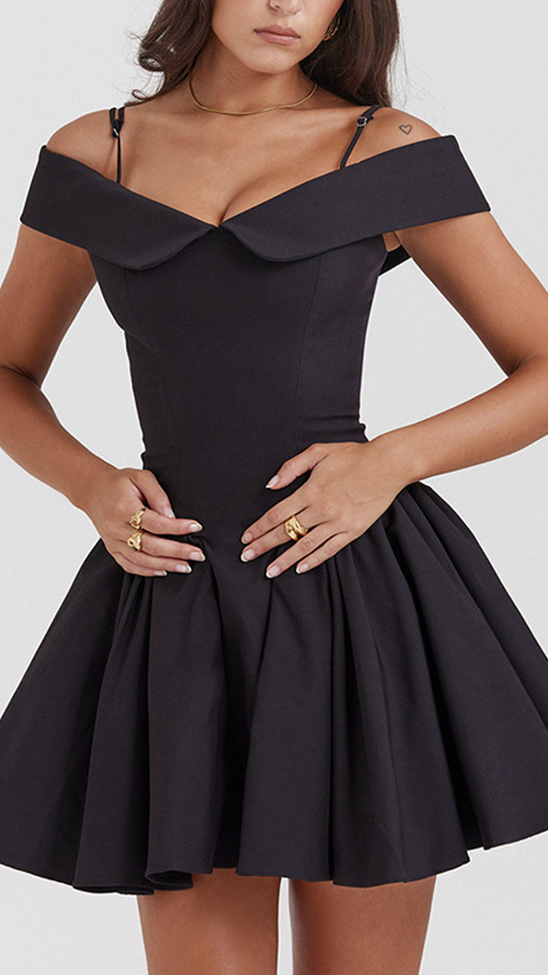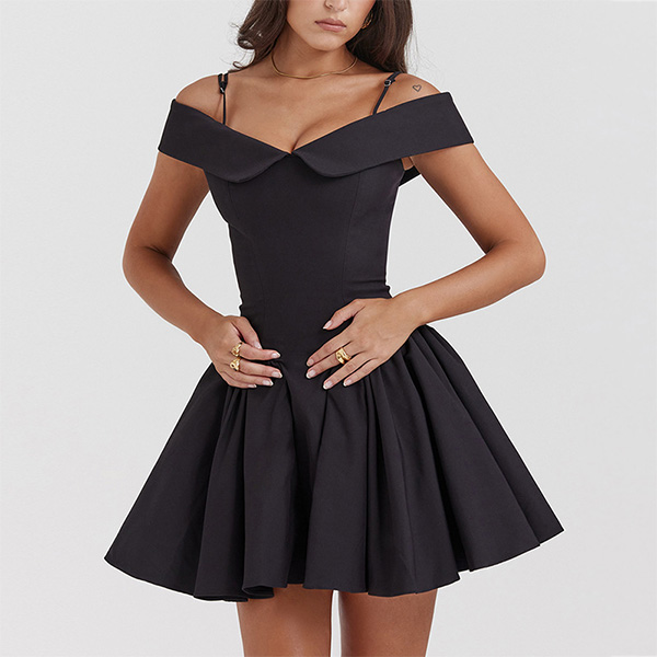 Crafted with high-quality fabric, this mini dress offers both style and comfort. The off-the-shoulder design adds a touch of allure and elegance to the dress. The high-rise waistline cinches in at the smallest part of your waist, creating a flattering and defined silhouette. Pair it with heels and statement accessories for a chic and glamorous ensemble.