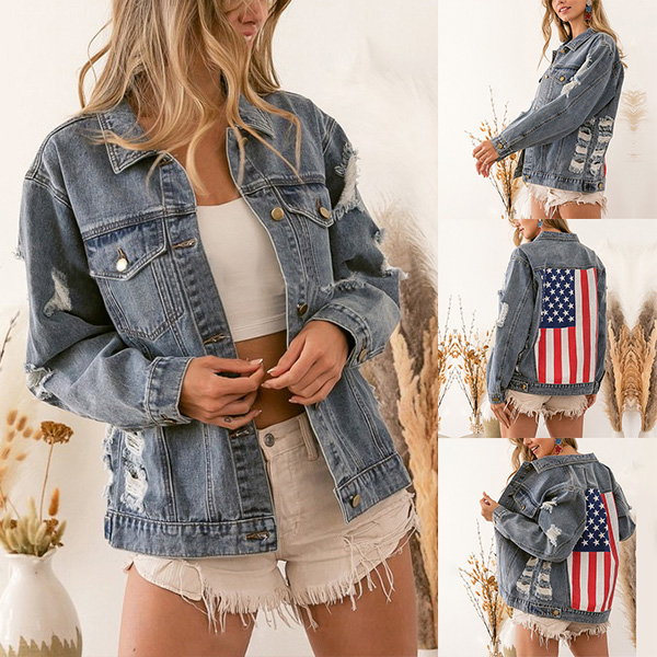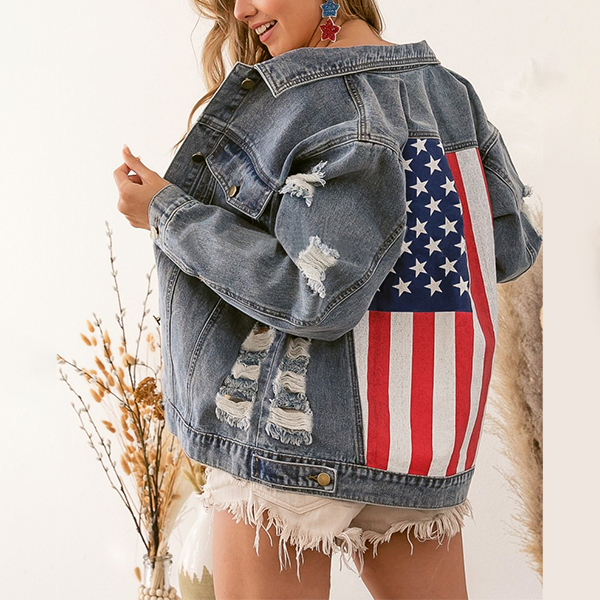 Fashion Old-wash Distressed American Flag Printed Denim Jacket