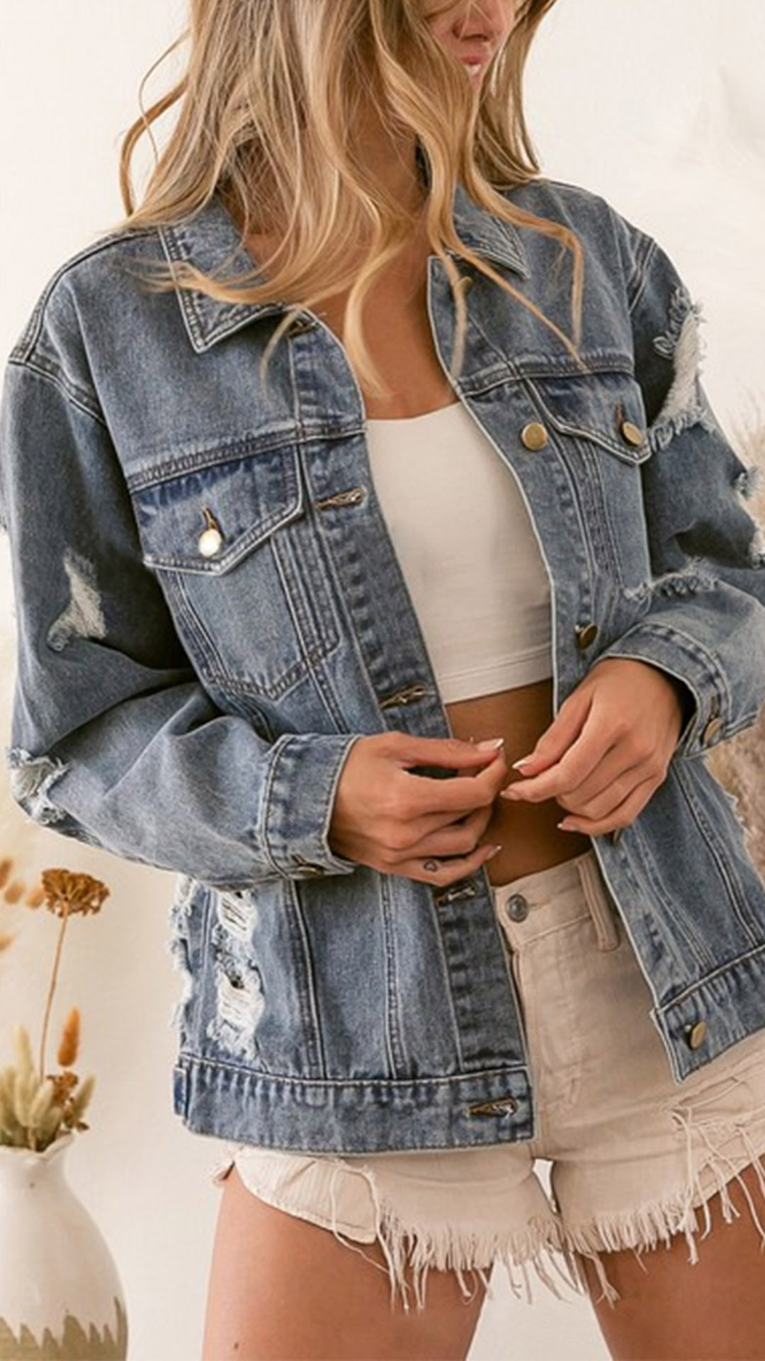 This denim jacket is versatile and easy to style. Layer it over a t-shirt and jeans for a casual and laid-back look. Pair it with a dress or skirt for a more edgy and fashion-forward ensemble.