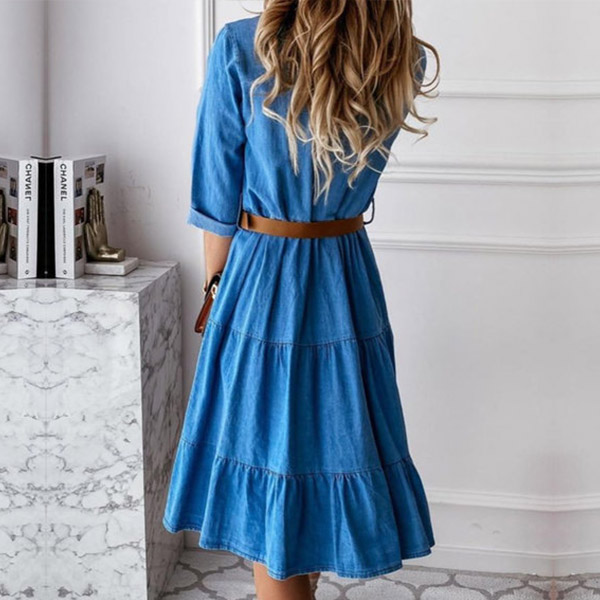 Fashion Old-wash Stand Collar Long Sleeve Tiered Denim Dress