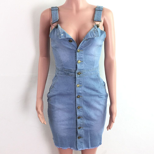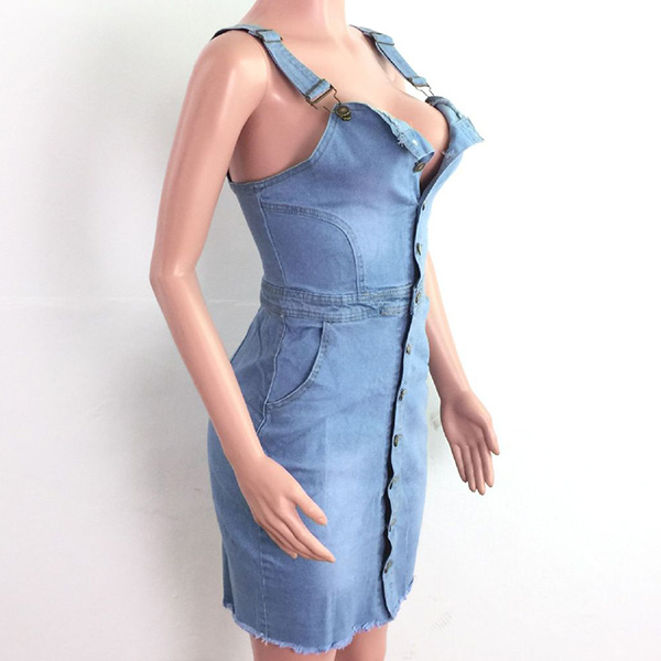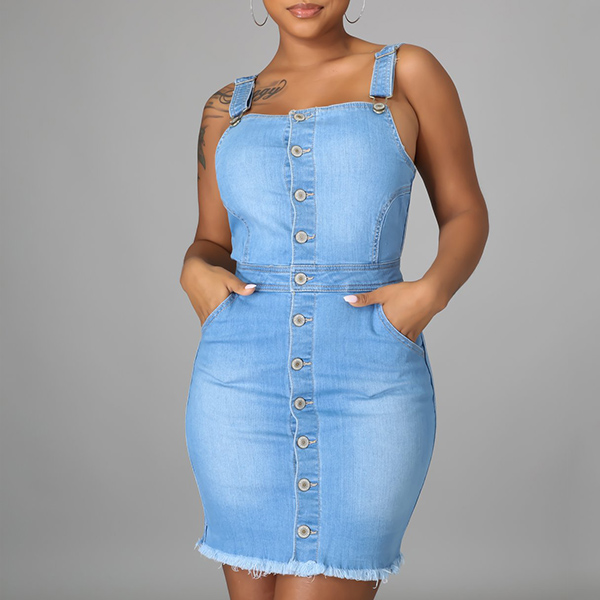 Denim dress featuring a thick adjustable shoulder strap, front buttoned design, slanted pockets, frayed hemline, and bodycon silhouette. Perfect for daily wear.