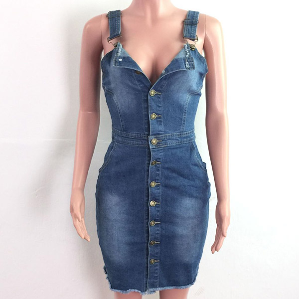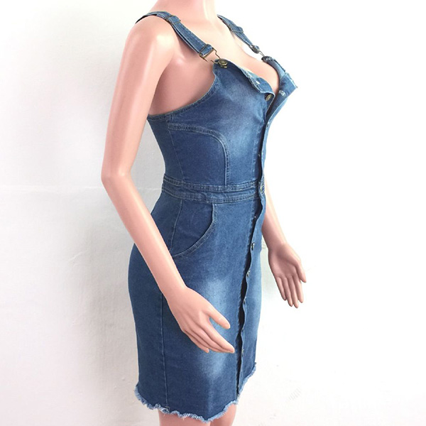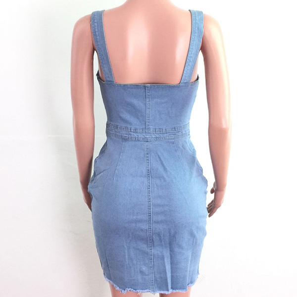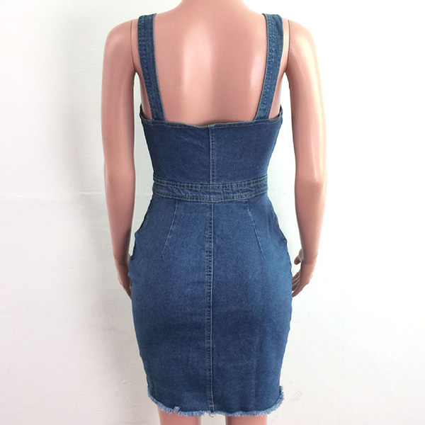Fashion Old-washed Buttoned Frayed Bodycon Denim Dress