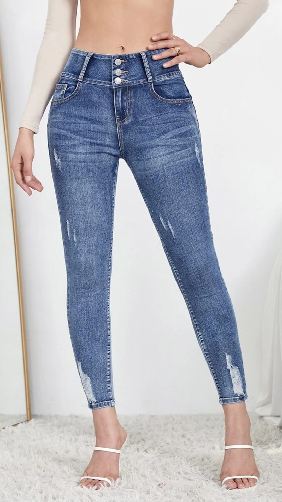 This fashion denim jeans features an old-washed denim fabric with distressed details and a high-rise skinny fit for a fashionable and street-style inspired look. Is it your style?