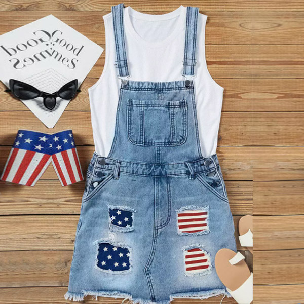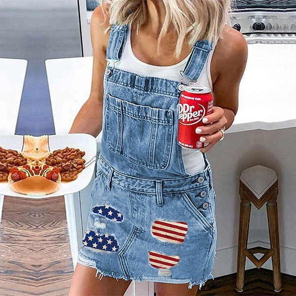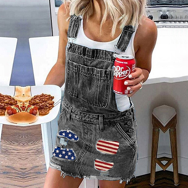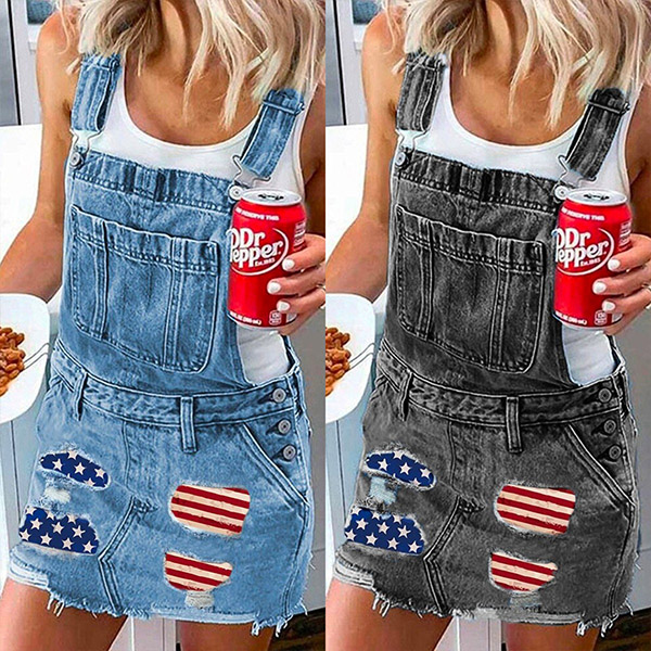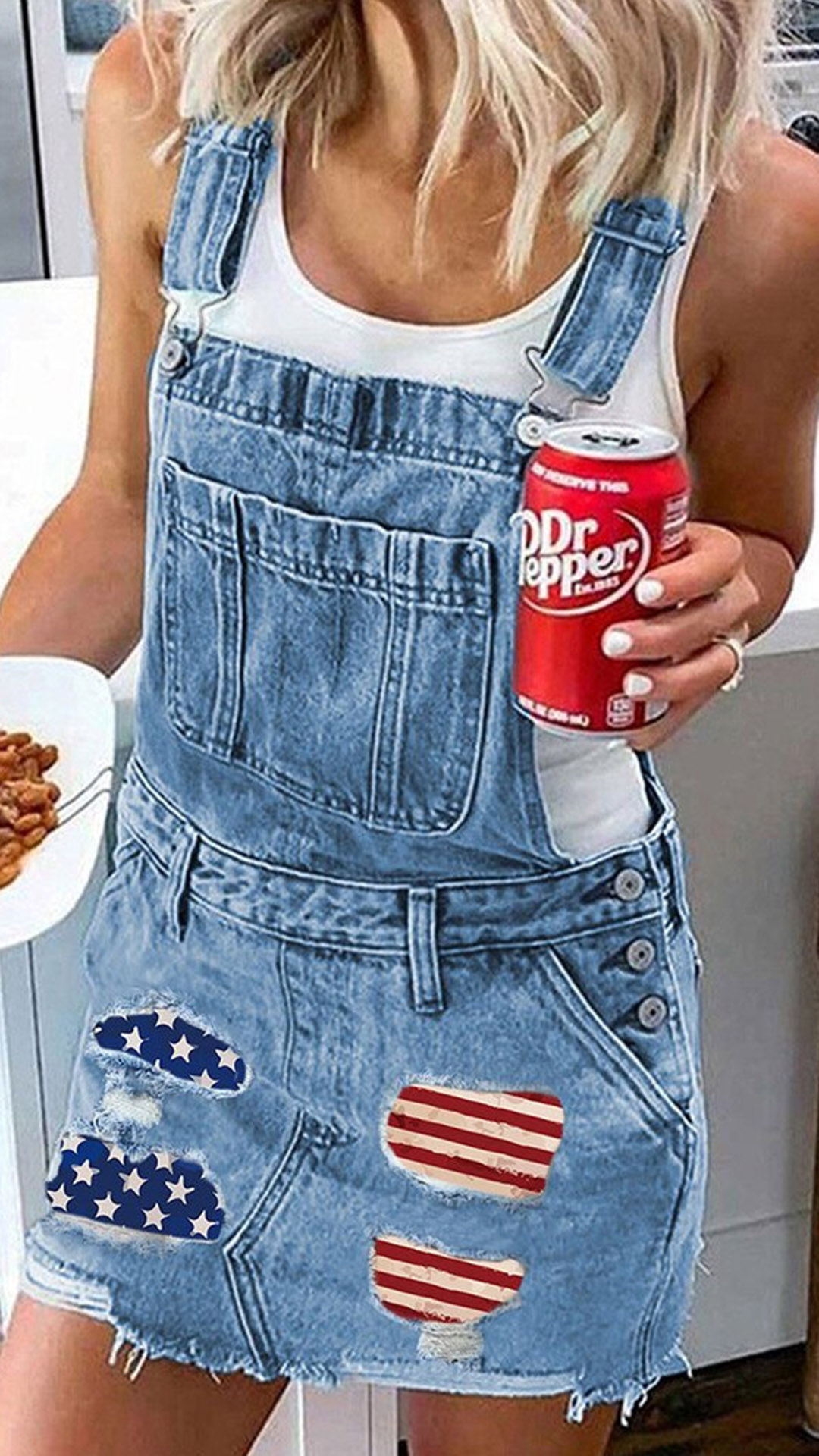 Fashion Old-washed Flag Printed Frayed Hemline Denim Suspender Dress