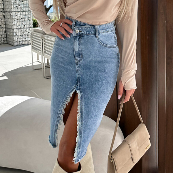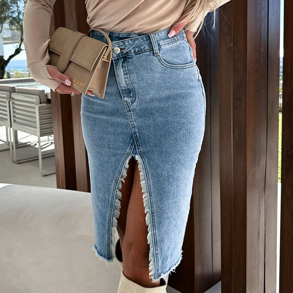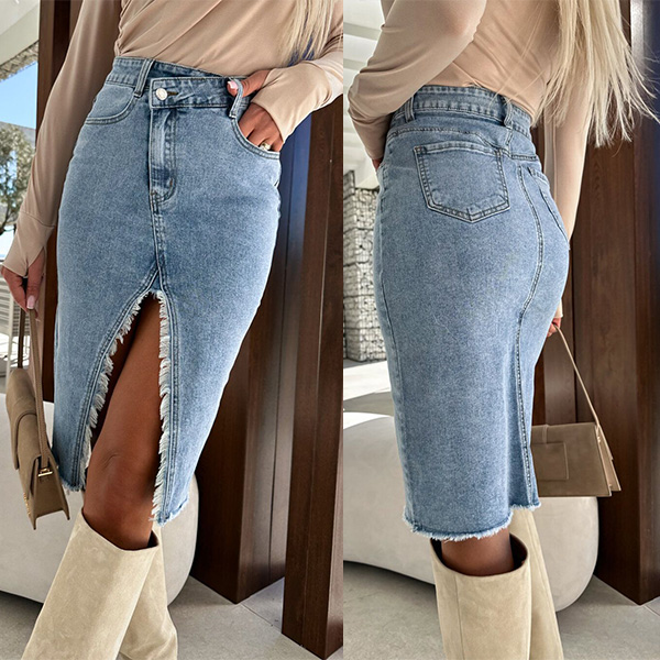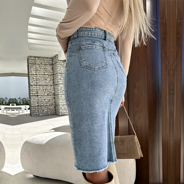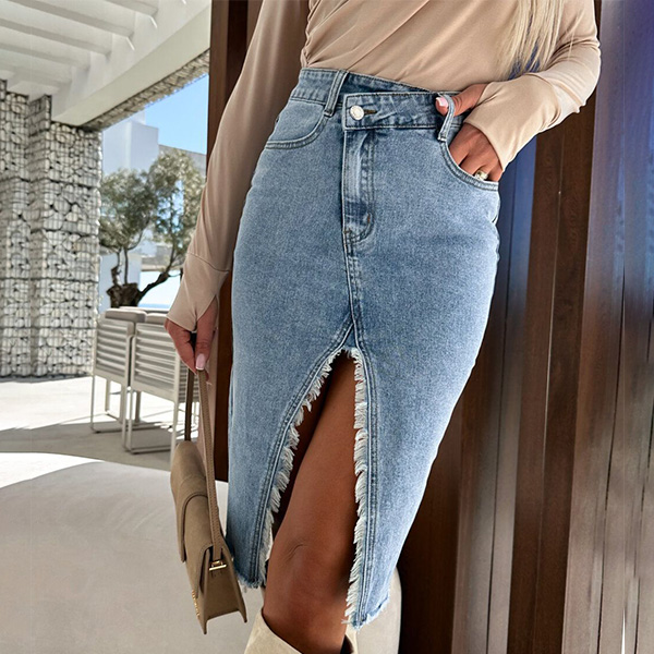 This skirt features a trendy old-washed denim design, with frayed detailing along the slit design, that adds a touch of edginess to the overall look. The versatile design of the skirt makes it perfect for pairing with a variety of tops and shoes, making it a must-have item for any fashion-conscious individual.