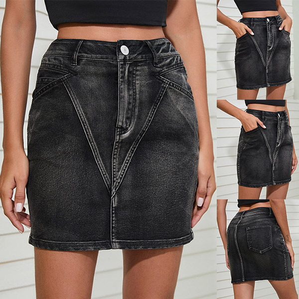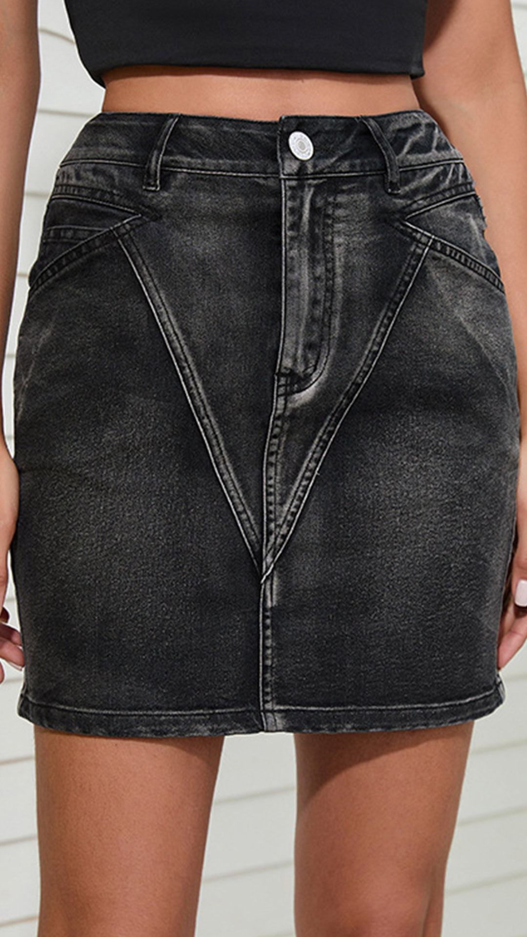 This is a stylish mid-rise denim skirt with an old-washed finish, giving it a unique vintage look.