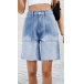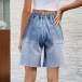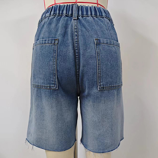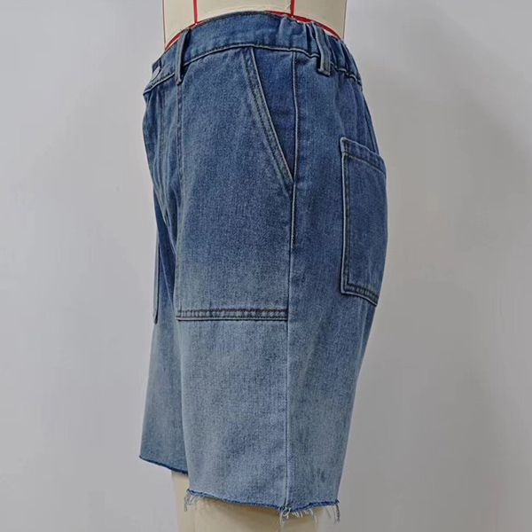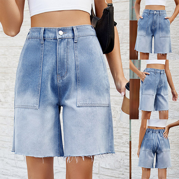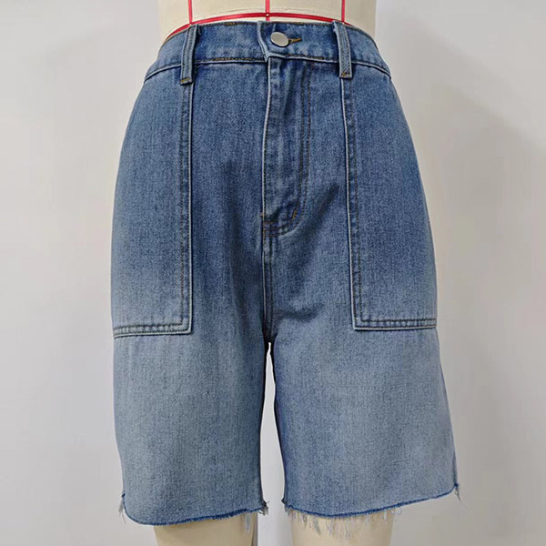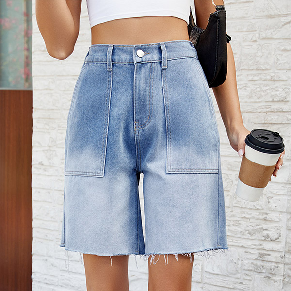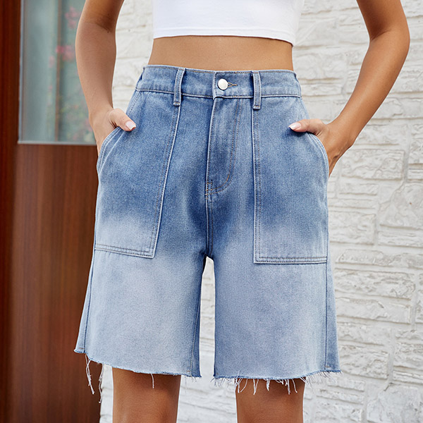 Fashion Old-washed Patch Pockets Frayed Hemline Gradient Color Denim Shorts