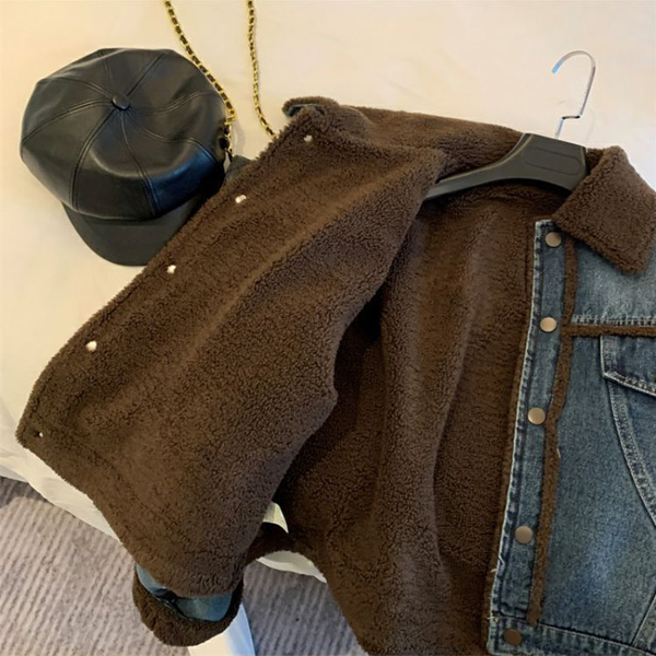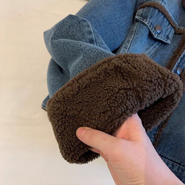 Fashion Old-washed Plush Lined Stand Collar Long Sleeve Denim Jacket