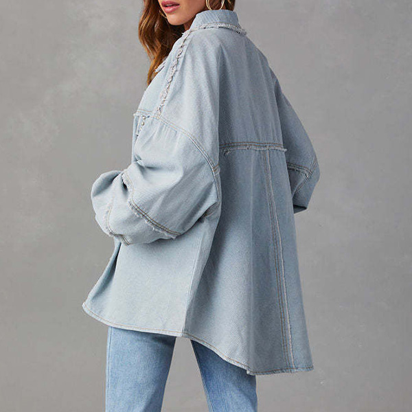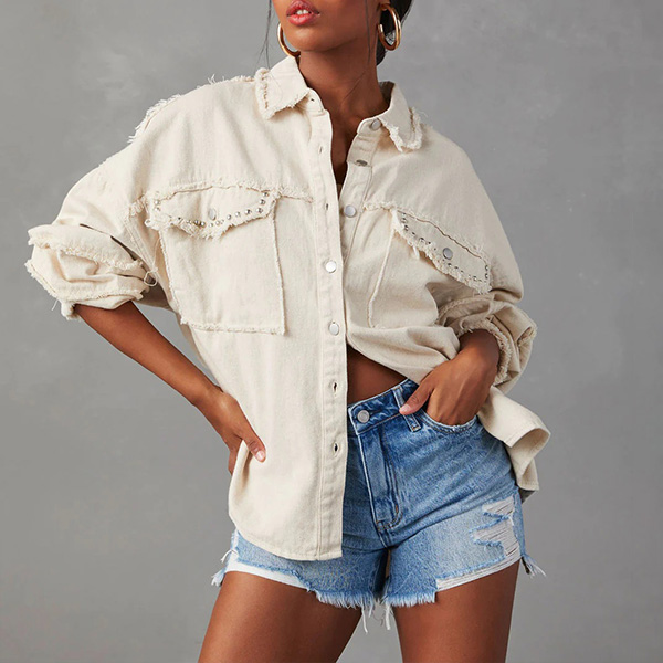 This denim shirt features an old-washed design with rhinestone detailing and a stand collar for a trendy and fashionable look. Perfect for daily wear!