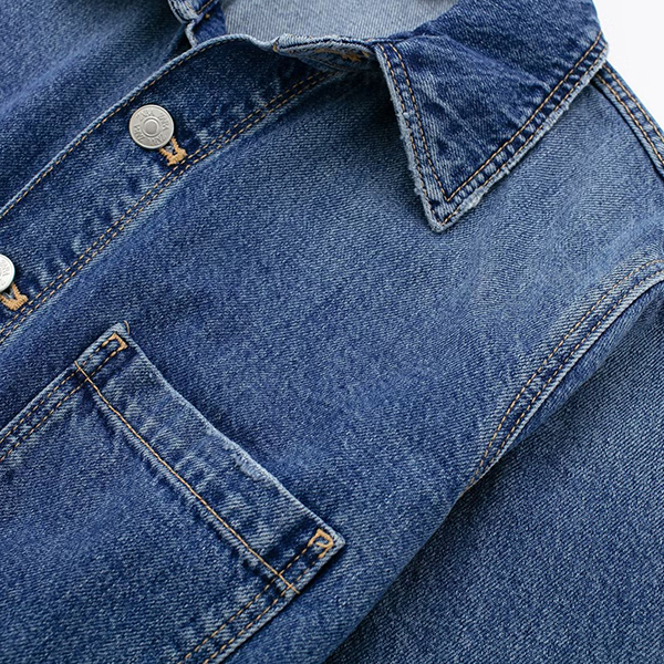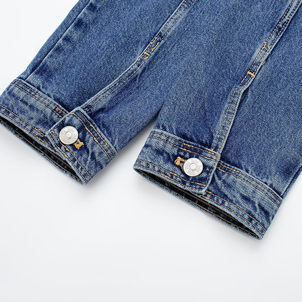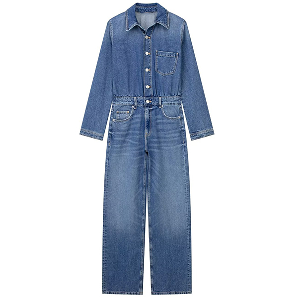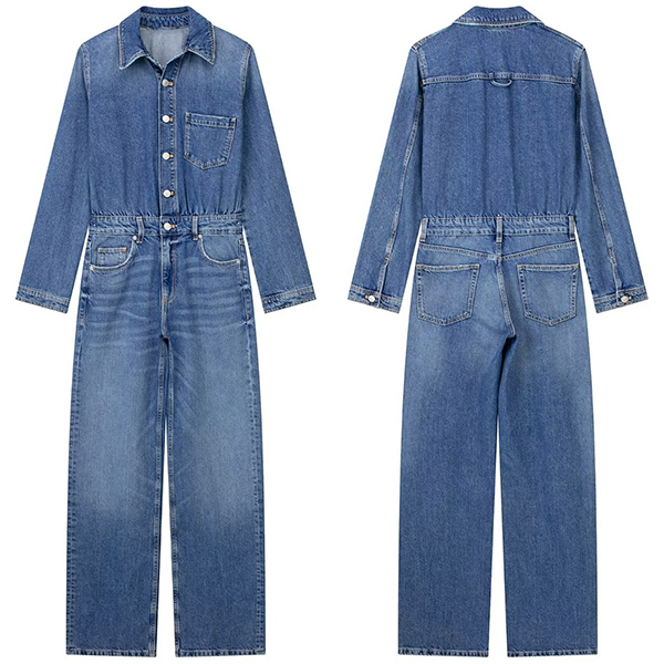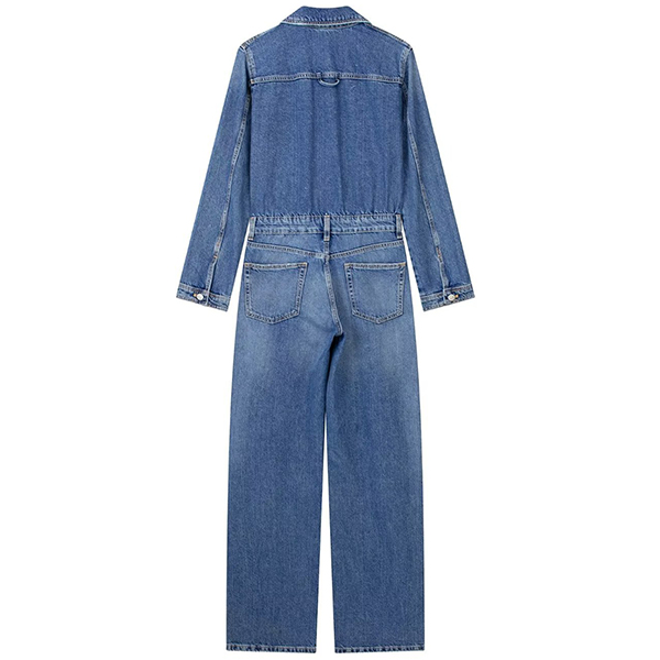 Fashion Old-washed Stand Collar Front Buttoned Long Sleeve Straight-cut Denim Jumpsuit