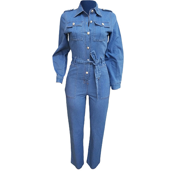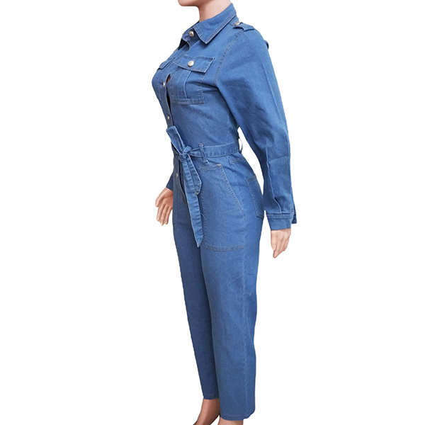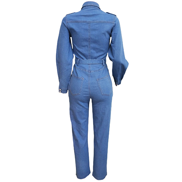 Fashion Old-washed Stand Collar Long Sleeve Buttoned Self-tie Denim Jumpsuit
