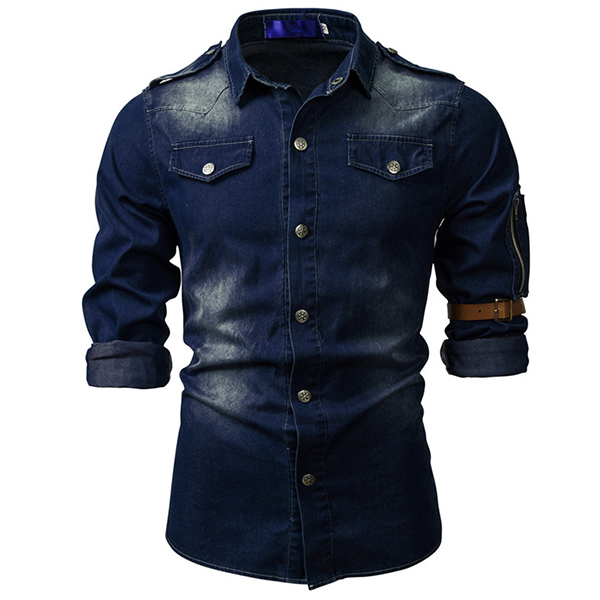 Fashion Old-washed Stand Collar Long Sleeve Denim Shirt for Men