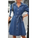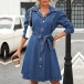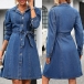 Fashion Old-washed Stand Collar Long Sleeve Self-tie Buttoned Blue Denim Dress